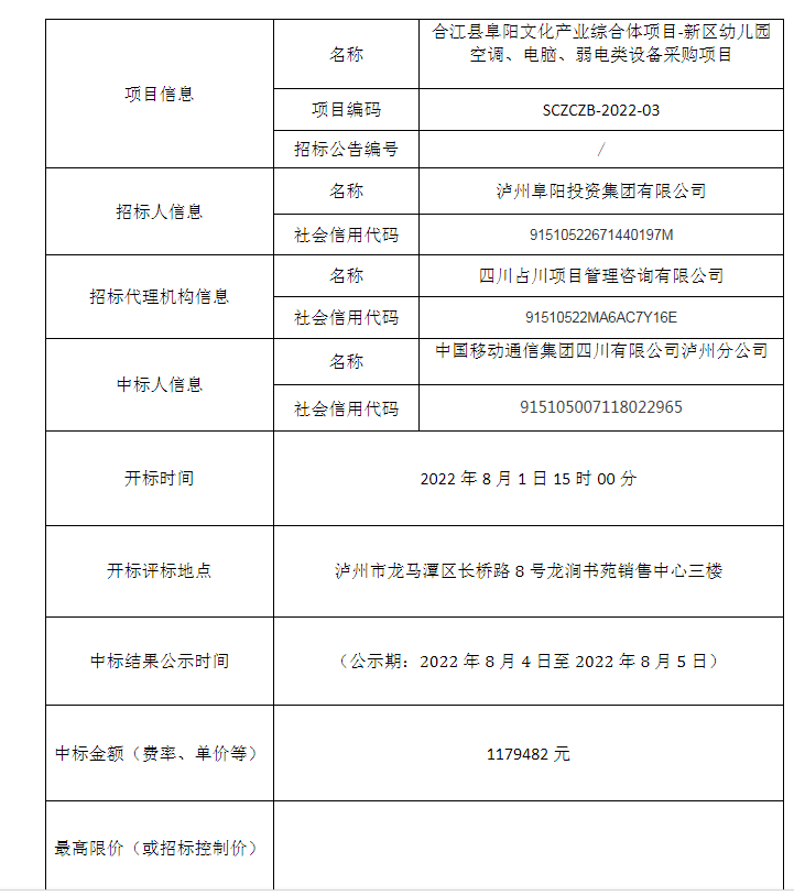 合江縣阜陽文化產(chǎn)業(yè)綜合體項(xiàng)目-新區(qū)幼兒園空調(diào)、電腦、弱電類設(shè)備采購項(xiàng)目公開招標(biāo)中標(biāo)結(jié)果公告