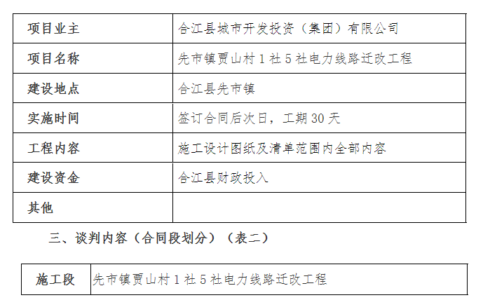 一、 本次談判項目為先市鎮(zhèn)賈山村 1 社 5 社電力線路遷改工程, 現(xiàn)通 過競爭性談判方式選擇和確定承包人, 誠邀符合資格條件的潛在申請 人參與本項目的競爭性談判。