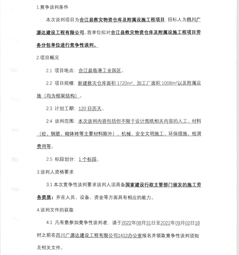 合江縣救災物資倉庫及附屬設施工程項 目 勞務分包單位競爭性談判的公告