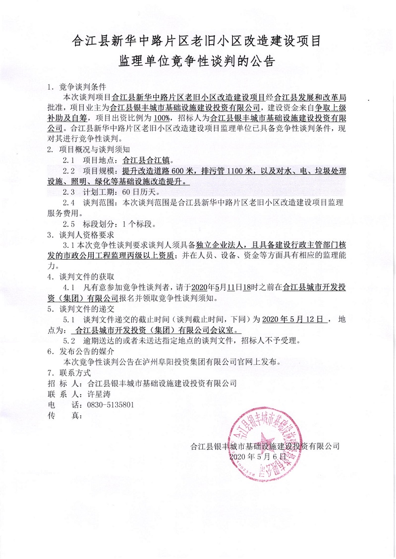 合江縣新華中路片區(qū)老舊小區(qū)改造建設(shè)項目監(jiān)理單位競爭性談判的公告