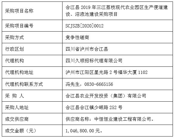 合江縣2019年三江荔枝現(xiàn)代農(nóng)業(yè)園區(qū)生產(chǎn)便道、沼液池建設采購項目競爭性磋商成交公告