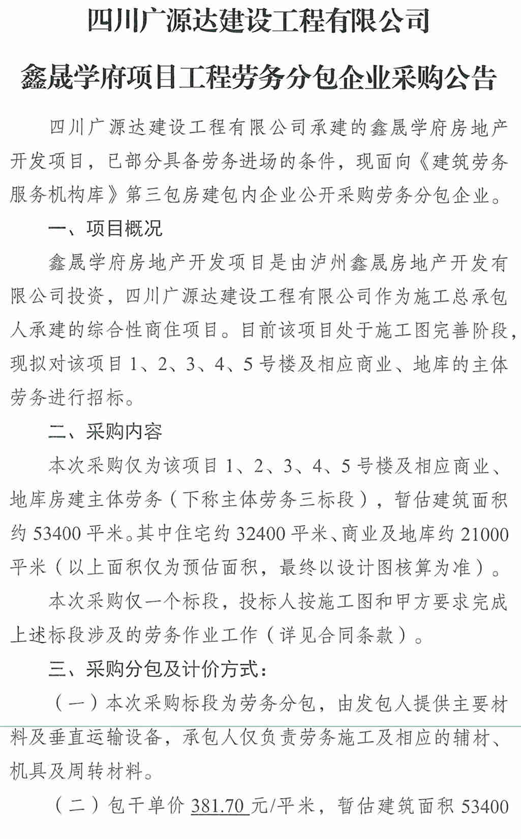 四川廣源達(dá)建設(shè)工程有限公司鑫晟學(xué)府項(xiàng)目工程勞務(wù)分包企業(yè)采購公告