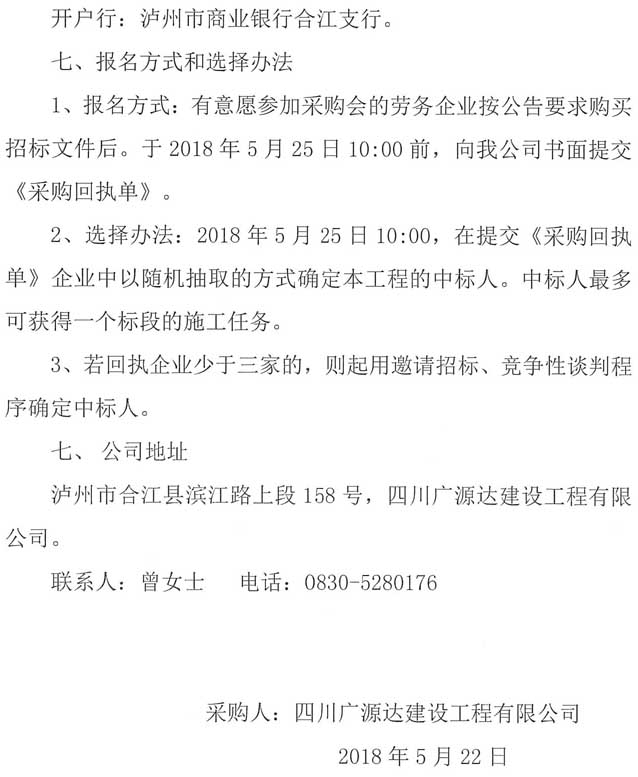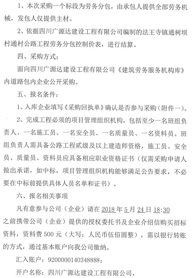 采購(gòu)公告:四川廣源達(dá)建設(shè)工程有限公司法王寺鎮(zhèn)通樹(shù)壩村通村公路工程勞務(wù)分包企業(yè)采購(gòu)公告