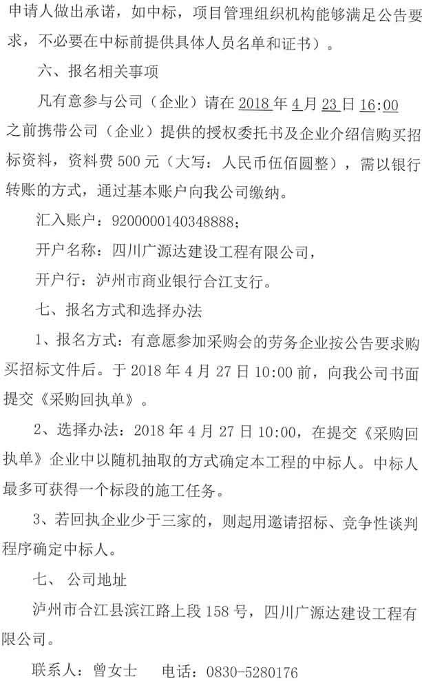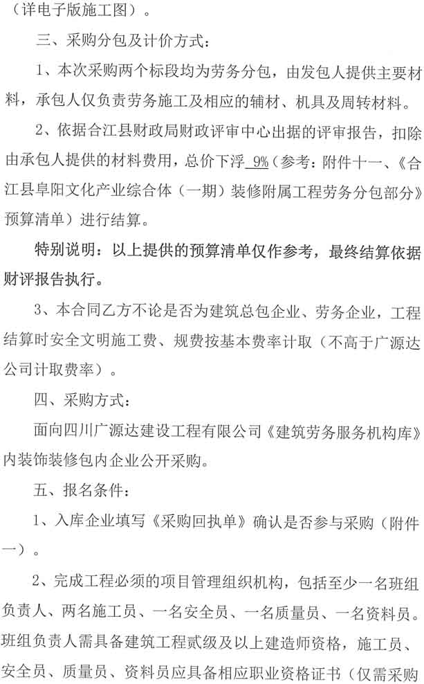 采購公告:四川廣源達建設(shè)工程有限公司阜陽文化產(chǎn)業(yè)綜合體(一期)裝修附屬工程勞務(wù)分包企業(yè)采購公告
