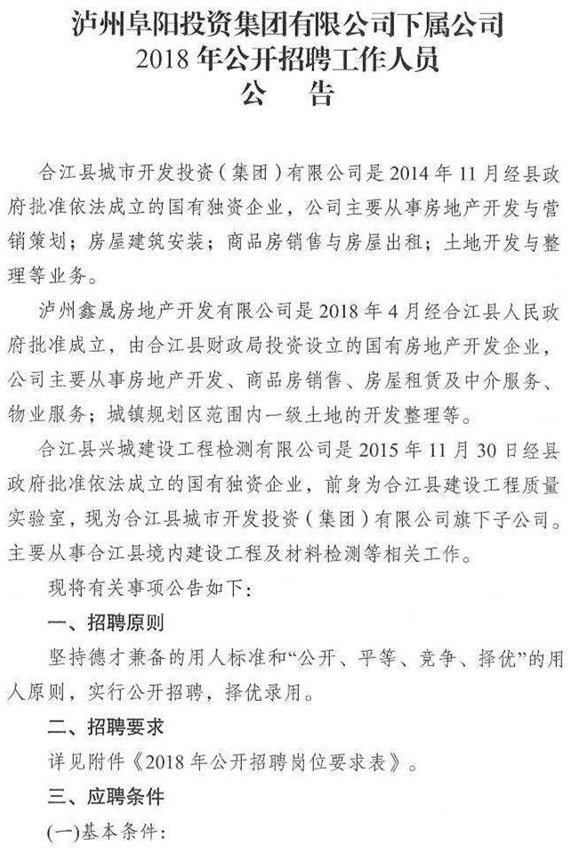 招聘公告:瀘州阜陽投資集團(tuán)有限公司下屬公司2018年公開招聘工作人員公告