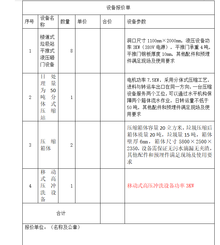 二、詢(xún)價(jià)內(nèi)容:1、樓道式垃圾站平推式液壓砸門(mén)設(shè)備及其配件8套;2、20立方米分體式壓縮站(包含一臺(tái)壓縮機(jī)構(gòu)、兩個(gè)箱體、一套水平移動(dòng)機(jī)構(gòu)、移動(dòng)式高壓清洗設(shè)備一套)及其配件1套(配套原有勾臂車(chē)使用)