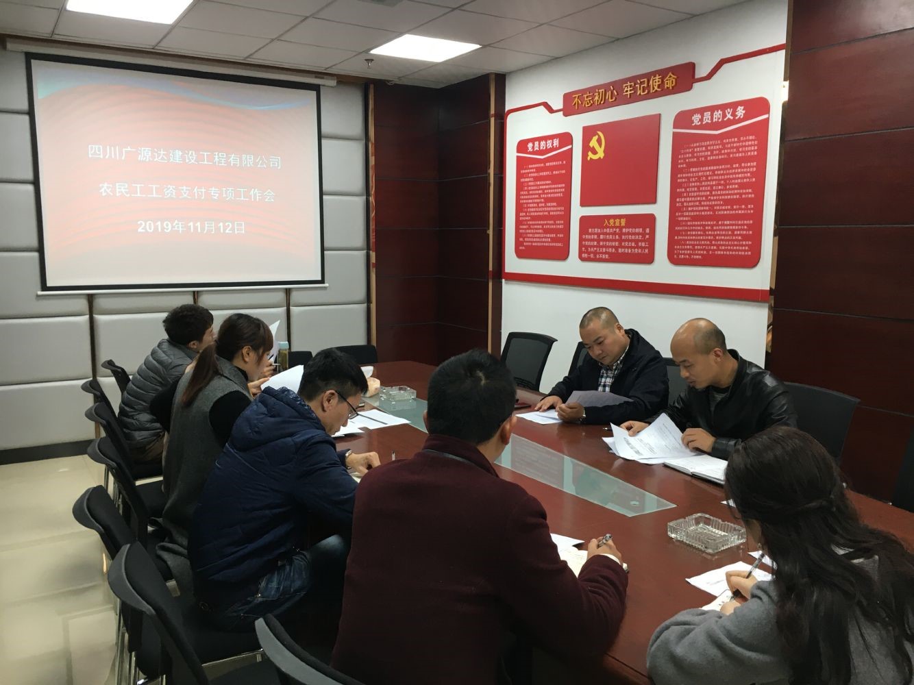 2019年11月12日,四川廣源達(dá)建設(shè)工程有限公司譙棣升董事長(zhǎng)主持召開(kāi)農(nóng)民工工資支付專(zhuān)項(xiàng)工作會(huì),公司各部門(mén)負(fù)責(zé)人、項(xiàng)目經(jīng)理參會(huì)。