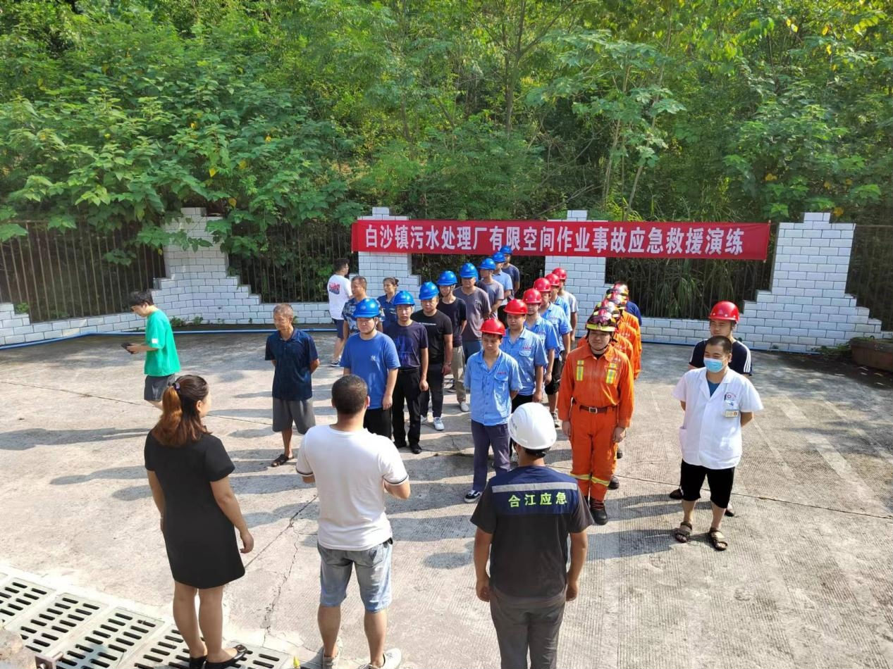 2022 年 8 月 5 日, 白沙鎮(zhèn)人民政府、 江北消防中隊(duì)、 白沙衛(wèi)生院和瀘州匯鑫環(huán)??萍加邢薰韭?lián)合在白沙鎮(zhèn)城市生活污水處理廠開(kāi)展有限空間作業(yè)應(yīng)急演練, 白沙鎮(zhèn)副鎮(zhèn)長(zhǎng)周雪蓮、 安辦主任牟葉奎、 江北消防中隊(duì)指導(dǎo)員王小峰、 匯 鑫公司副經(jīng)理劉可參加了本次演練。